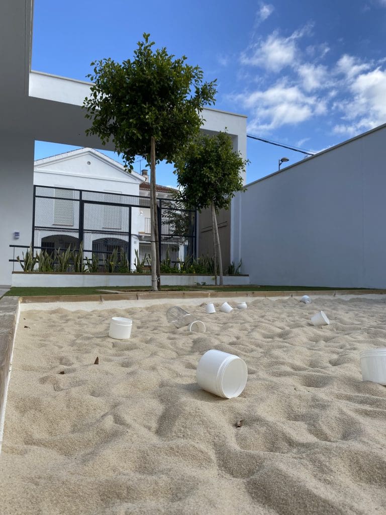 Este soportal eleva su altura libre hasta los 5 metros y su vuelo de 7 metros unidos a una cancela de chapa perforada que permite una visión desde el exterior al patio configuran un acceso a un conjunto en el que patio y edificación se fusionan a través de grandes huecos y entrada de luz para que los más pequeños puedan desarrollar su imaginación y explorar sin límites.